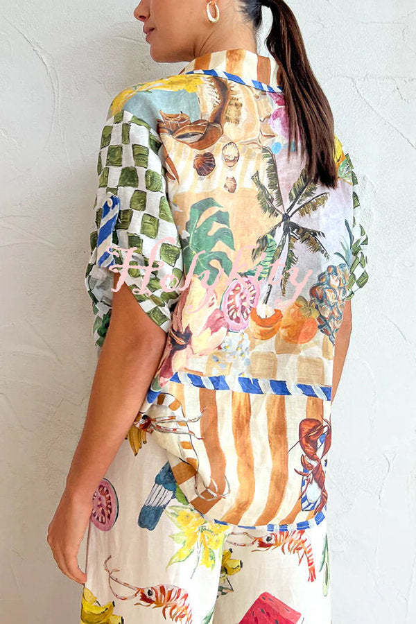 Spicy Lady Linen Blend Tropical Fruit Print Button Down Oversized Blouse